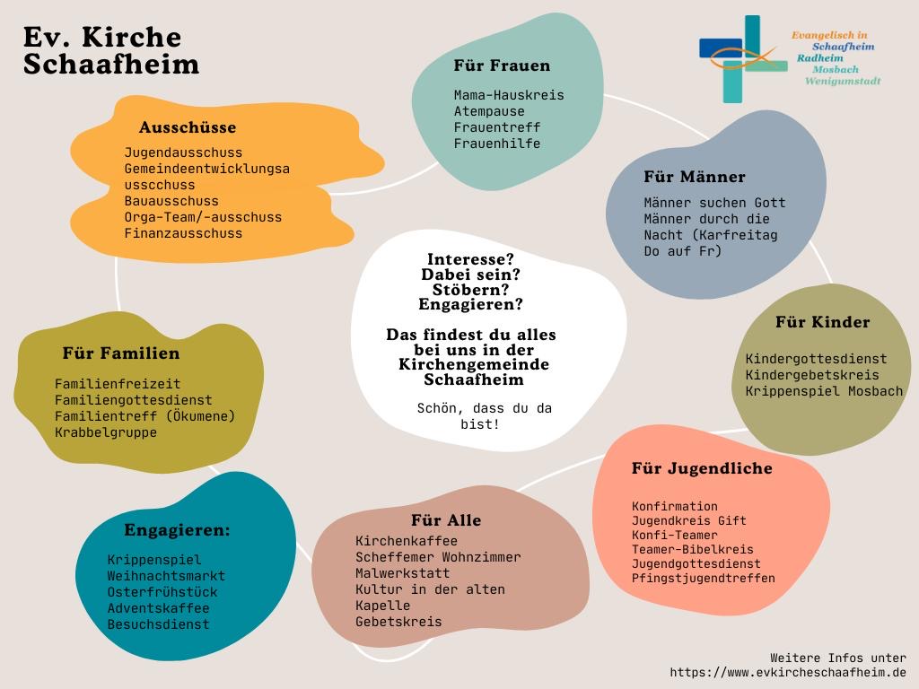 Die Evangelische Kirchengemeinde Schaafheim umfasst die Kerngemeinde Schaafheim sowie die Ortsteile Radheim und Mosbach sowie die auf bayrischer Seite gelegene Ortschaft Wenigumstadt.